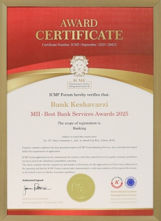 بانک کشاورزی موفق به دریافت جایزه «بهترین خدمات بانکی سال ۲۰۲۵» از سوی مجمع بینالمللی مدیریت خلاق (ICMF) شد.